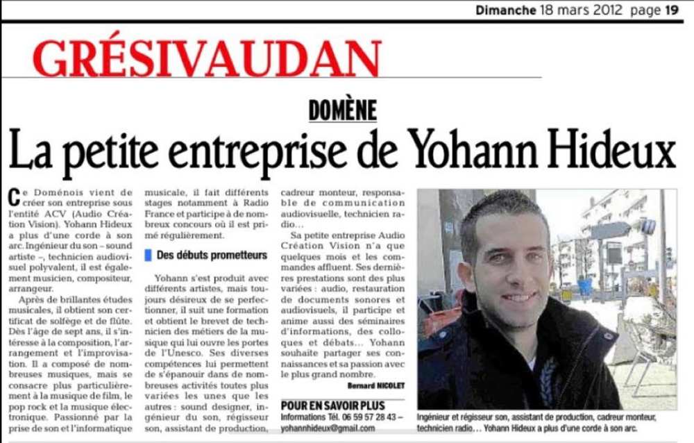 Ce Doménois vient de créer son entreprise sous l'entité ACV (Audio Creation Vision). Yohann Hideux à plus d'une corde à son arc. Ingénieur du son - sound artiste -, technicien audiovisuel polyvalent, il est également musicien, compositeur, arrangeur.